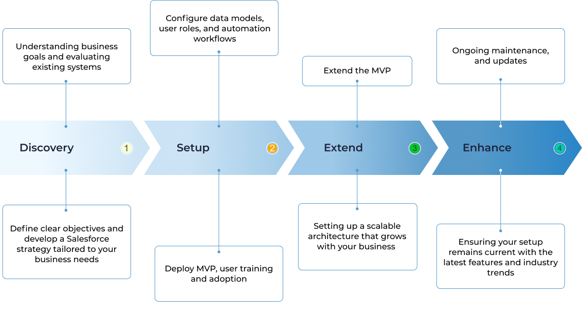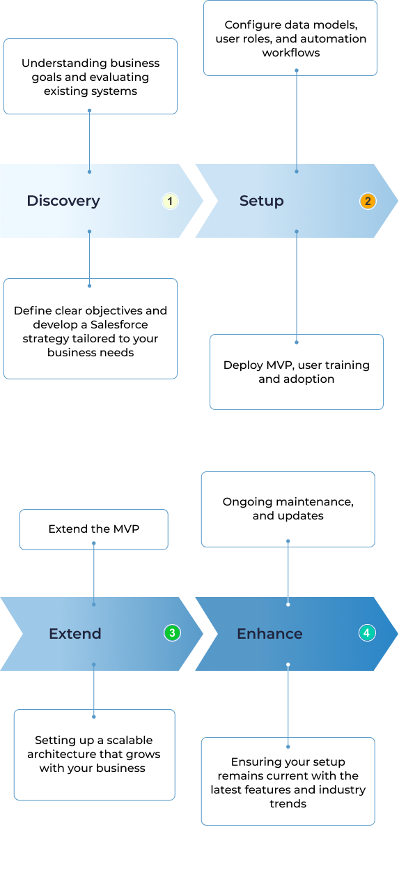 Get end-to-end Salesforce implementation tailored to your business needs and processes. From planning and customization to deployment and training, ensure a smooth and successful CRM adoption.